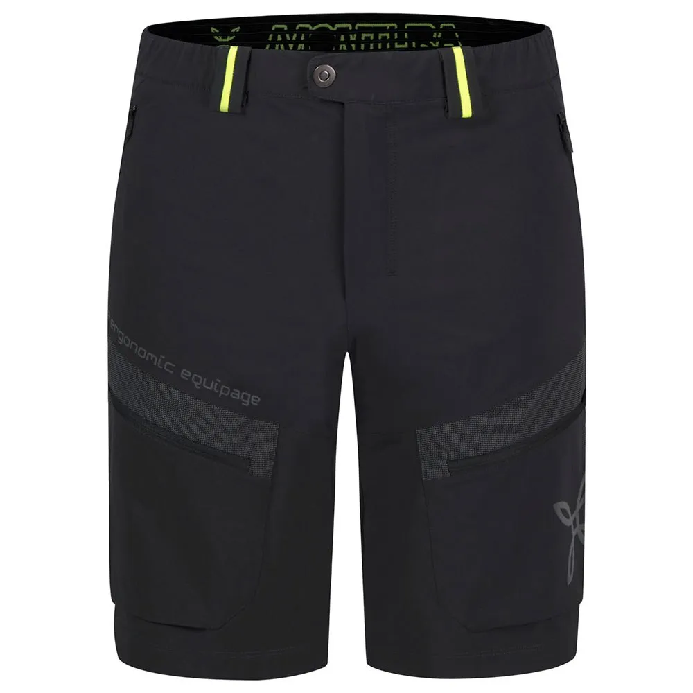– Vita con elastico e passanti, apertura con bottone, zip e velcro.
